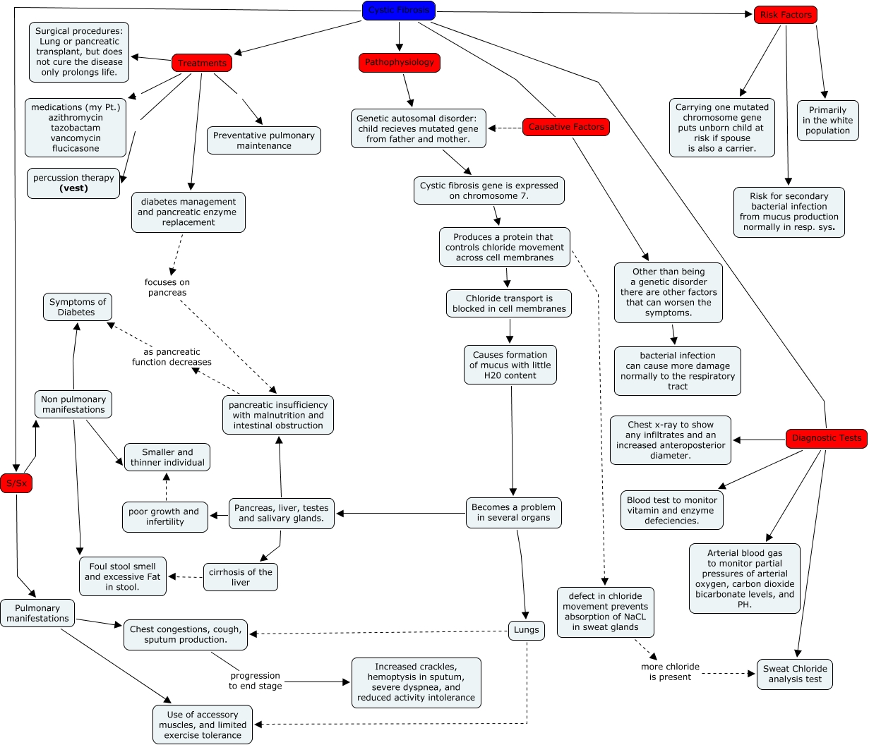 Cystic Fibrosis PATHOPHYSIOLOGY CONCEPT MAP Risk Factors Family History of CF Race mainly occurs in whites of northern European ancestry Potential Complications Pneumonia Malnutrition Dehydration Death Thick Mucous Signs Symptoms Abnormal sweat gland function Lower respiratory tract infections Impaired secretion clearance Chronic productive cough Chronic colonization by. Start studying Cystic fibrosis concept map. Child recieves mutated gene from father and mother Cystic fibrosis gene is expressed on chromosome 7.