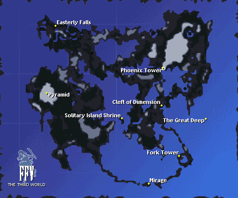 Here are my shortcuts. Third World Underwater 414 KB. At the grasslands of squares B7 and E8 and the forests of F8 you can find the encounters from near Quelb before Exdeath merged the two worlds.