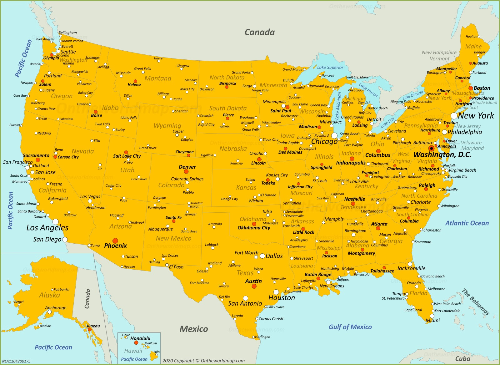 6838x4918 121 Mb Go to Map. Above is a USA printable map showing the capitals and the major cities. The 10 Biggest Airports In The World.